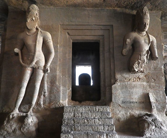 In contrast, in mantapa-style architecture, such as that seen in the Badami caves, the garbhagriha is located at the rear and typically has a single entrance, making circumambulation within the sanctum impossible. This is a key feature that distinguishes Cave 1 at Elephanta from the Badami cave temples.