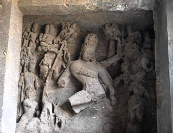 Nataraja is a popular theme in Shiva temples. For instance, in the Nataraja panel of Cave 1 at Badami, Shiva performs the vigorous tandava nritya (tandava dance), a dynamic cosmic dance associated with creation, preservation, and destruction. In contrast, the Elephanta panel presents a more lalita (charming) expression of the cosmic dance, as characterized by the Archaeological Survey of India (ASI), highlighting its graceful and elegant quality.