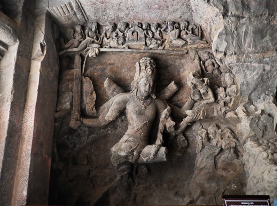 This panel is severely damaged, and as seen in the image, the lower half is missing many important figures. What remains is a fierce form of Shiva with multiple arms, most of which are broken; only one hand, holding a sword, is intact. The ASI (Archaeological Survey of India) has identified this panel as depicting the story of Shiva slaying Andhakasura, and a plaque beside the panel provides a brief account of the episode.